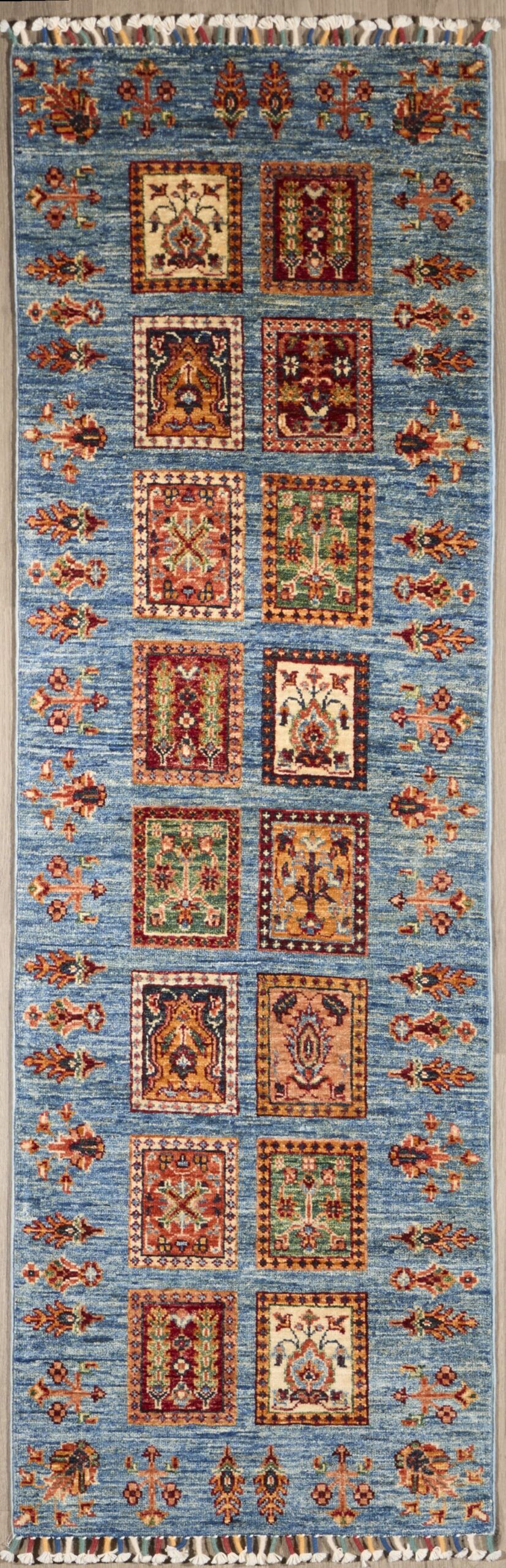 Inspired by traditional garden and panel motifs, this hand-knotted Afghani Gaeden rug is a harmonious blend of symmetry, color, and heritage. Expertly woven from durable, highland mountain wool, it features a rich texture and vibrant tones that reflect generations of craftsmanship. Each panel tells a story, making this rug a timeless centerpiece with both cultural depth and decorative elegance.