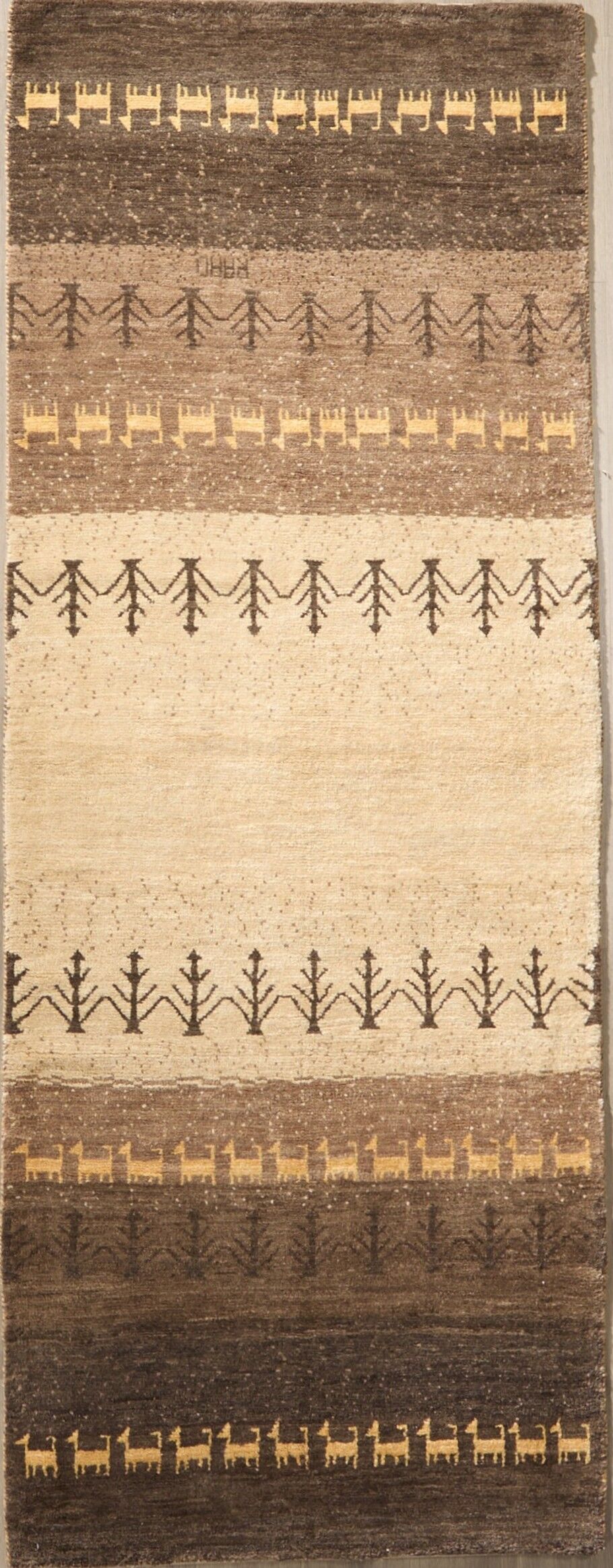 Hand-knotted by skilled artisans of the Qashqai tribe, this Persian Gabbeh rug is made from 100% fine mountain wool and colored with natural vegetable dyes. Featuring timeless motifs such as the Tree of Life, human figures, animals, and elements of nature, it is a soulful expression of tribal heritage and craftsmanship.
