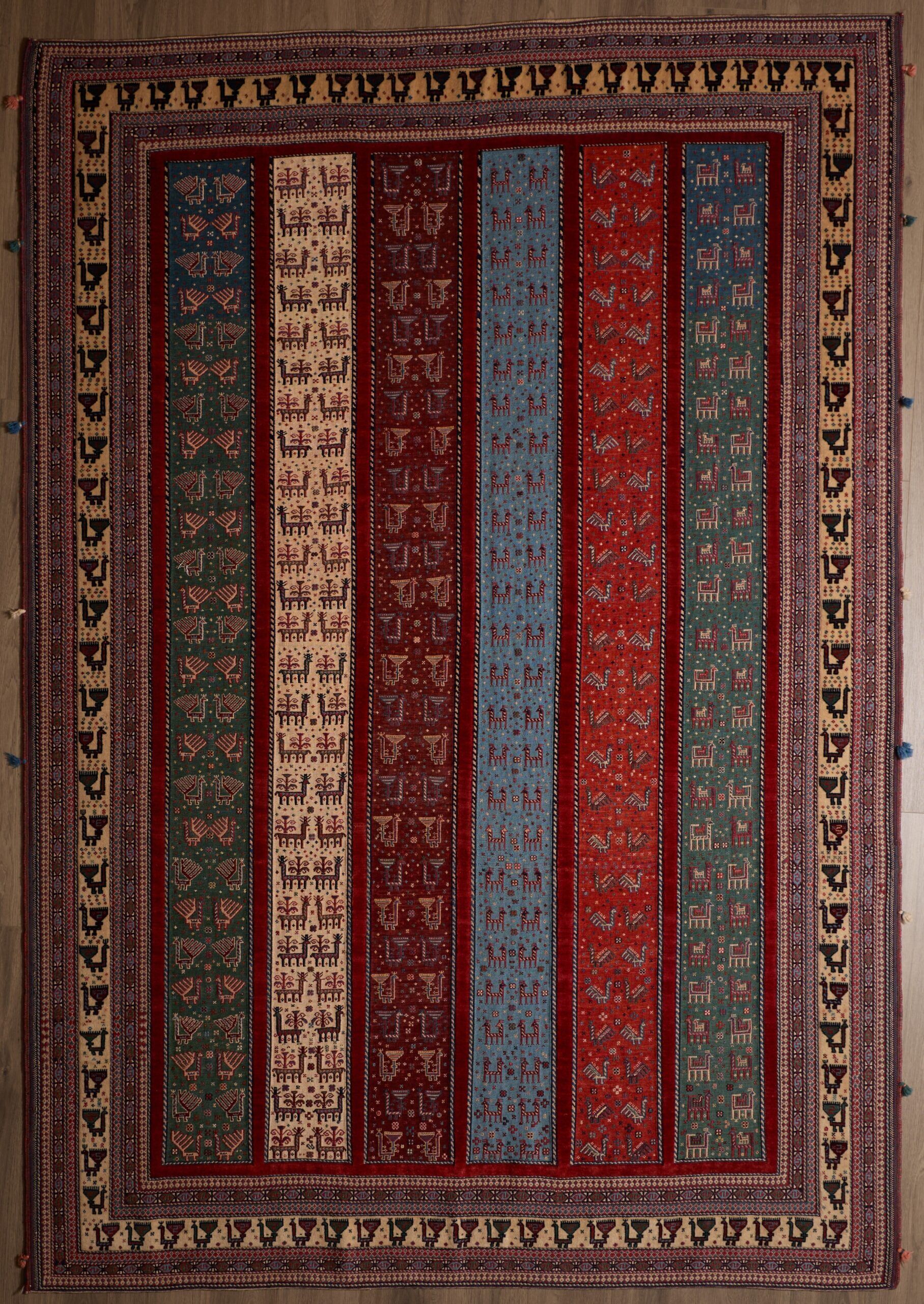Crafted from hand-spun mountain wool and dyed with natural vegetable pigments, this exquisite rug blends the bold geometry of Gabbeh and Kelim traditions with the intricate charm of Suzani motifs. A true work of art, it brings warmth, texture, and timeless beauty to any space—an heirloom-quality piece from the artisans at Kian Rug Company.